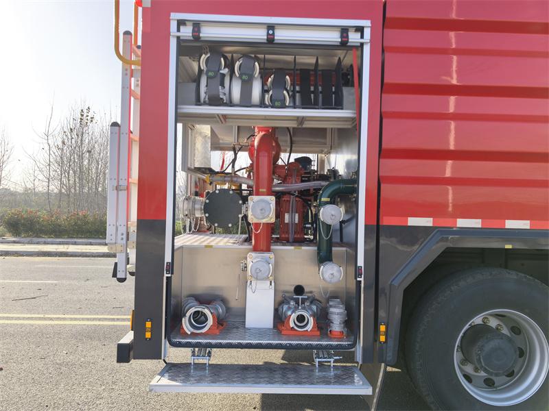 Một máy bơm chữa cháy CB10/140-XZ với lưu lượng định mức 100L/s@1MPa được lắp đặt trong phòng bơm ở phía sau xe. Máy bơm chữa cháy này đáng tin cậy và có thể cung cấp áp lực nước mạnh, đảm bảo vòi chữa cháy có thể phun nước hoặc bọt với áp suất cao trên khoảng cách xa để dập tắt đám cháy.